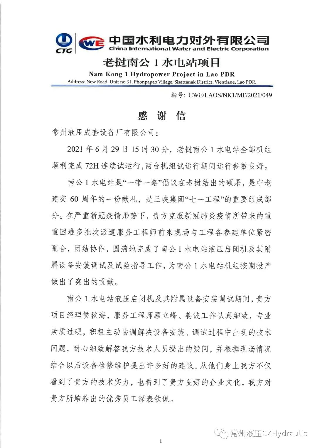 喜迎中國(guó)共產(chǎn)黨建黨100周年華誕之際,老撾南公1水電站項(xiàng)目部發(fā)來感謝信,感謝常州液壓在疫情防控期間克服重重困難派遣服務(wù)工程師指導(dǎo)南公1水電站液壓?jiǎn)㈤]機(jī)及其附屬設(shè)備安裝調(diào)試工作,項(xiàng)目經(jīng)理積極協(xié)調(diào)解決現(xiàn)場(chǎng)問題,保障了南公1水電站機(jī)組按期投產(chǎn)發(fā)電!