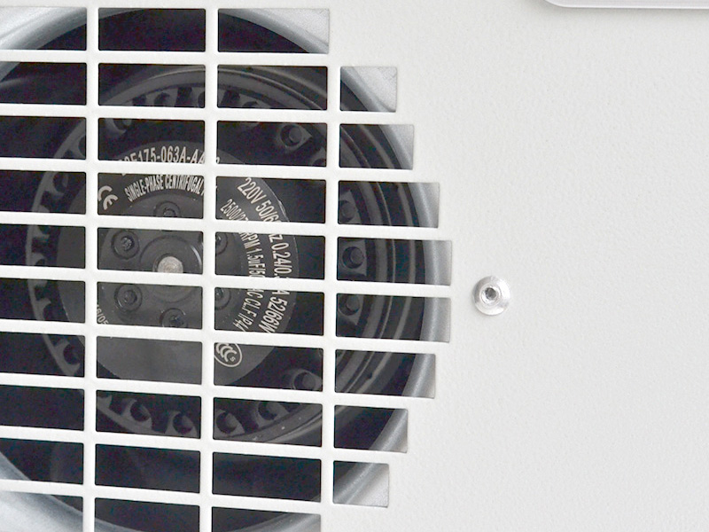 空調(diào)器內(nèi)循環(huán)的風(fēng)扇從上部吸入熱空氣,使空氣不斷通過(guò)蒸發(fā)器的翅片進(jìn)行熱交換,并將放熱后變冷的空氣從下部排出空調(diào)器,并送向柜內(nèi)。如此柜內(nèi)空氣不斷循環(huán)流動(dòng),達(dá)到降低溫度的目的。同時(shí),外部循環(huán)的風(fēng)扇從下部吸入外界冷空氣,經(jīng)過(guò)熱交換后熱空氣從上部排出空調(diào)器。